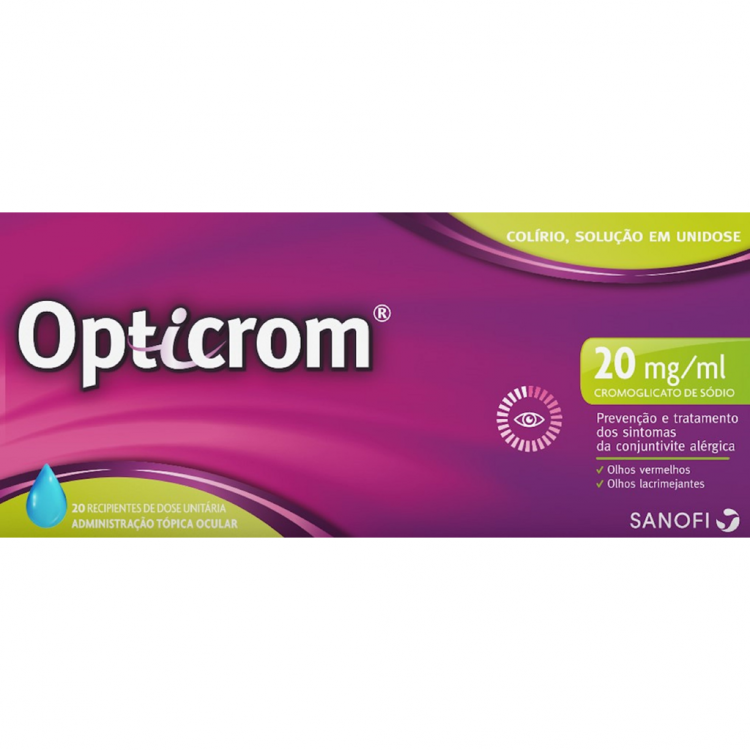Opticrom está indicado para a prevenção e tratamento dos sintomas da conjuntivite alérgica persistente (perene) ou sazonal, tais como olhos vermelhos e lacrimejantes. Opticrom é uma solução estéril, sem conservantes e que se apresenta num recipiente unidose que deve ser utilizado imediatamente após abertura. Caso a solução não seja utilizada na sua totalidade, deve rejeitar o recipiente de dose unitária. Opticrom deverá ser utilizado regularmente de forma a assegurar um controlo ótimo dos sintomas. Recomenda-se que o tratamento se mantenha durante o período de exposição ao alérgeno mesmo quando livre dos sintomas. Os utilizadores de lentes de contacto devem remover as lentes antes de aplicar o medicamento. Lave cuidadosamente as mãos antes de aplicar o colírio. Puxe delicadamente a pálpebra inferior para baixo e coloque cuidadosamente as gotas no espaço entre o olho e pálpebra inferior, segundo a recomendação médica ou farmacêutica. Tenha o cuidado de não tocar com a ponta do frasco no olho. Solte a pálpebra inferior e pisque algumas vezes para assegurar a totalidade do olho é coberto pelo líquido. Os utilizadores de lentes de contacto devem remover as lentes antes de aplicar o medicamento. Em caso de tratamento simultâneo com outro colírio, espere 15 minutos entre a aplicação dos 2 colírios.