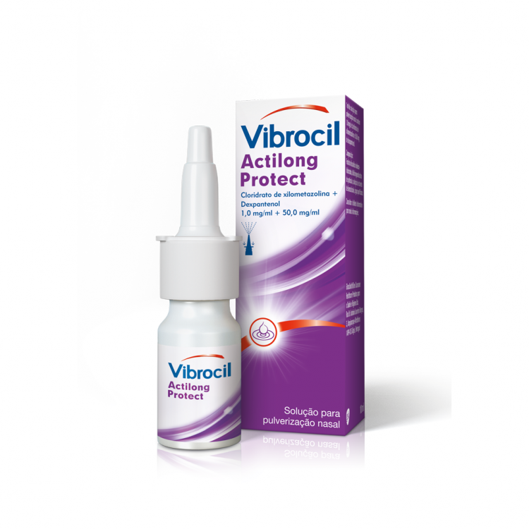 Vibrocil Actilong Protect é um descongestionante com tripla ação, que permite recuperar dos sintomas nasais da constipação 2 dias mais rápido*. Indicado para reduzir o inchaço da mucosa nasal na rinite e para estimular a cicatrização da mucosa nasal, para o alívio da rinorreia (rinite vasomotora) e para o tratamento da obstrução nasal após cirurgia ao nariz. Ainda indicado para reduzir o inchaço da mucosa nasal na rinite associada à inflamação aguda dos seios paranasais (rinossinusite). *Comparativamente à xilometazolina isolada. Resultado de 5 dias de tratamento. Adultos e adolescentes com idade igual ou superior a 12 anos: Uma pulverização em cada narina conforme necessário, mas até um máximo de 3 vezes por dia. Não pulverizar os olhos. 1. Limpar o nariz. 2. Segurar o frasco na posição vertical com o dedo polegar sob a base e a ponta do pulverizador entre os dois dedos. 3. Inclinar ligeiramente para a frente e inserir a ponta do pulverizador numa narina. 4. Pulverizar e inspirar suavemente pelo nariz, em simultâneo. Repetir o procedimento na outra narina. 5. Após utilização limpar imediatamente a ponta do pulverizador e colocar a tampa protetora. 6. Para evitar a propagação de infeções, o spray deve ser utilizado apenas por uma pessoa.