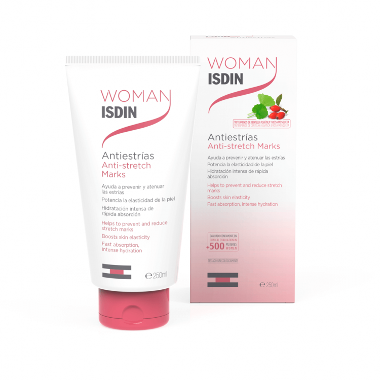 WOMAN ISDIN Antiestrias é um creme corporal que contém centelha asiática, óleo de rosa mosqueta, manteiga de Shorea e vitamina E com ação antioxidante. Possui evidência clínica que demonstra eficácia na ajuda da prevenção e redução de estrias, assim como uma valorização superior da sua fórmula pelas suas características sensoriais.