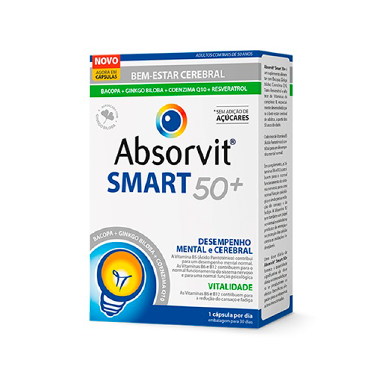 Absorvit® Smart 50+ é um suplemento alimentar com Bacopa, Ginkgo biloba, Coenzima Q10, Trans-Resveratrol e alto teor de Vitaminas do complexo B, especialmente desenvolvido para o bem-estar cerebral de adultos, a partir dos 50 anos de idade.