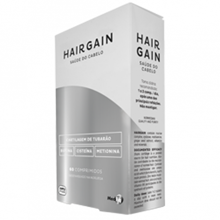 Hairgain® é um suplemento desenvolvido para estimular o crescimento capilar e fortalecer o cabelo, tornando-o mais forte e volumoso. Na sua fórmula destaca-se a cartilagem de tubarão, que fornece as proteínas essenciais para a nutrição do cabelo e aminoácidos como a cisteína e metionina, que constituem a queratina, principal proteína do cabelo. Este suplemento, de origem norueguesa, atua contra o cabelo frágil, desvitalizado, espigado e quebradiço, contra a queda de cabelo sazonal e ainda como reforço de tratamentos anti queda.