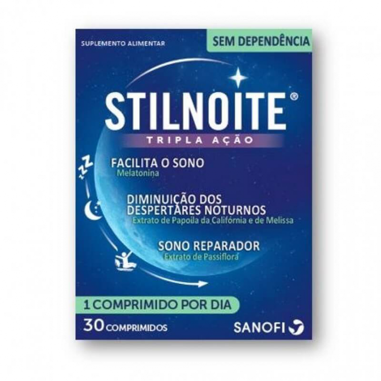 Stilnoite Tripla Ação comprimidos é um suplemento alimentar, que ajuda a melhorar o sono. Contribui para uma ação mais relaxante e reduz o tempo necessário para adormecer. Tem uma ação sobre a fase inicial do sono graças à melatonina que contribui para reduzir o tempo necessário para adormecer. A eficácia está comprovada com a toma de 1 comprimido antes de deitar. Stilnoite tem uma ação sobre a qualidade do sono com diminuição dos despertares noturnos devido ao extrato de papoila da Califórnia e Melissa, de origem 100% vegetal. Stilnoite proporciona um sono reparador devido ao extrato de Passiflora, de origem 100% vegetal. Consumir no âmbito de uma dieta variada e equilibrada e um estilo de vida saudável. Não recomendado no caso de alergia a qualquer um dos ingredientes.